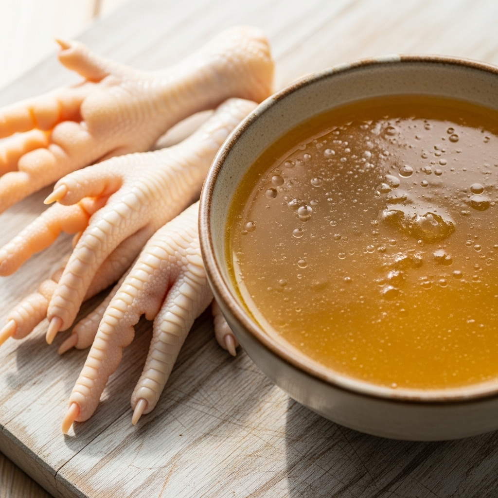- Ekstraksi Gelatin Maksimal: Tanpa adanya penghalang berupa kulit ari yang keras, tulang dan tulang rawan (cartilage) pada ceker akan langsung terekspos pada air panas. Hal ini mempercepat proses peleburan jaringan ikat menjadi gelatin alami yang memberikan tekstur "kental" pada kaldu, melapisi dinding usus bayi, dan membantu perkembangan persendian mereka.
