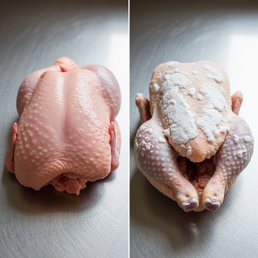 - Oksidasi Lemak (Rancidity): Berlawanan dengan mitos umum, proses pembekuan tidak menghentikan reaksi kimiawi secara total. Lemak intramuskular pada ayam yang dibekukan berbulan-bulan tetap mengalami oksidasi lambat, yang memicu aroma tengik (apek) dan merusak profil rasa umami saat ayam diolah menjadi kaldu.