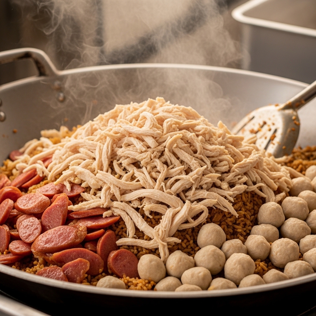 Q: Mengapa ayam suwir sering mengeluarkan bau amis saat dimasukkan ke dalam minyak dan bumbu nasi goreng panas? A: Bau amis atau tengik tersebut adalah hasil dari oksidasi lemak (Warmed-Over Flavor). Ini umumnya terjadi karena pedagang menggunakan ayam yang sudah lama dibekukan, atau ayam stok sisa kemarin yang kualitas selulernya sudah menurun tajam, sehingga bereaksi negatif saat terkena panas tinggi.