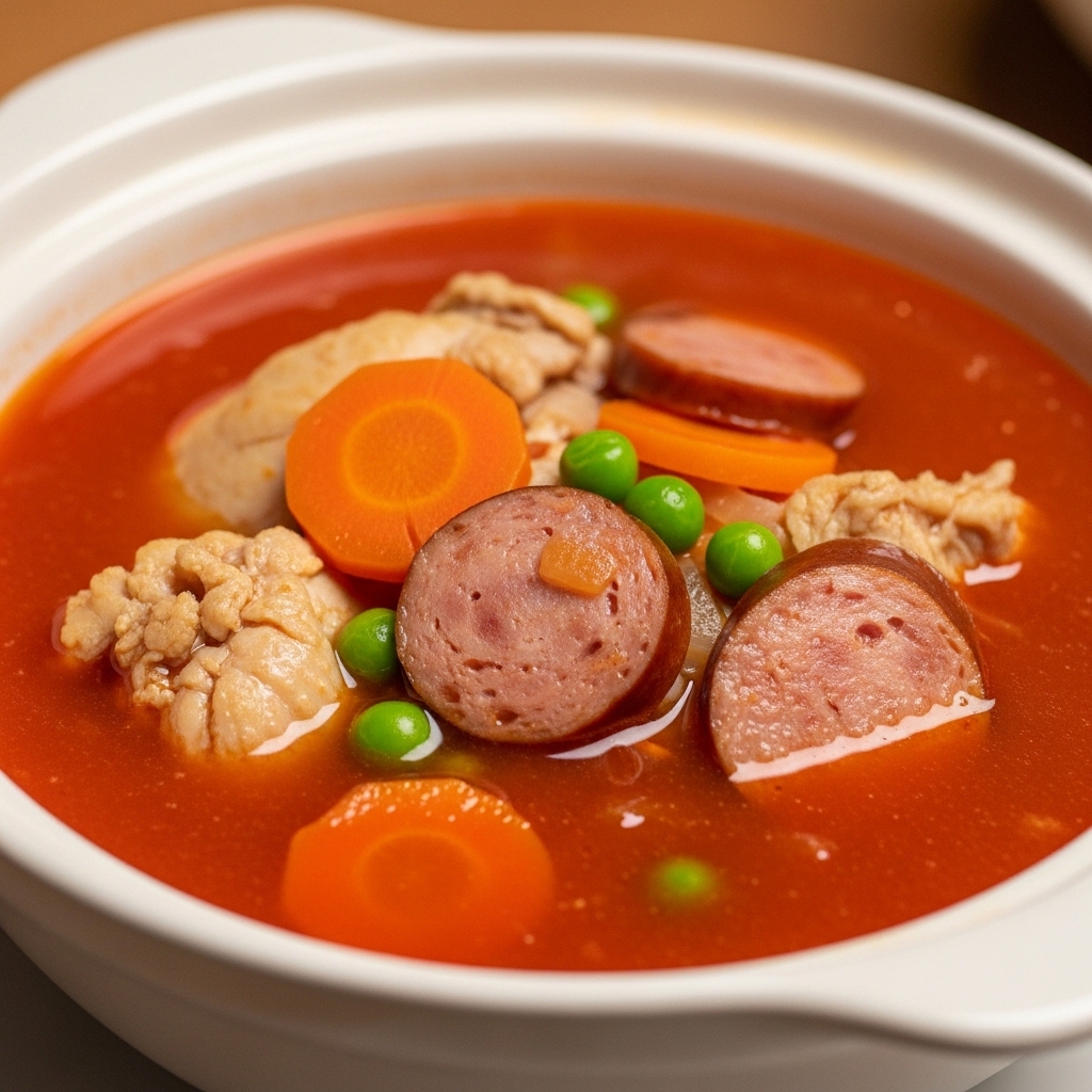 Sop merah ayam sosis adalah hidangan berkuah kaldu kaldu pekat yang dibumbui dengan sari tomat merah khas nusantara, yang berfungsi sebagai menu penghangat tubuh favorit di warung tenda kaki lima, di mana kecerahan warna merah kuahnya sangat bergantung pada penggunaan karkas ayam utuh segar untuk menghindari pelepasan buih darah kotor (scum) yang dapat menodai estetika kuah.
