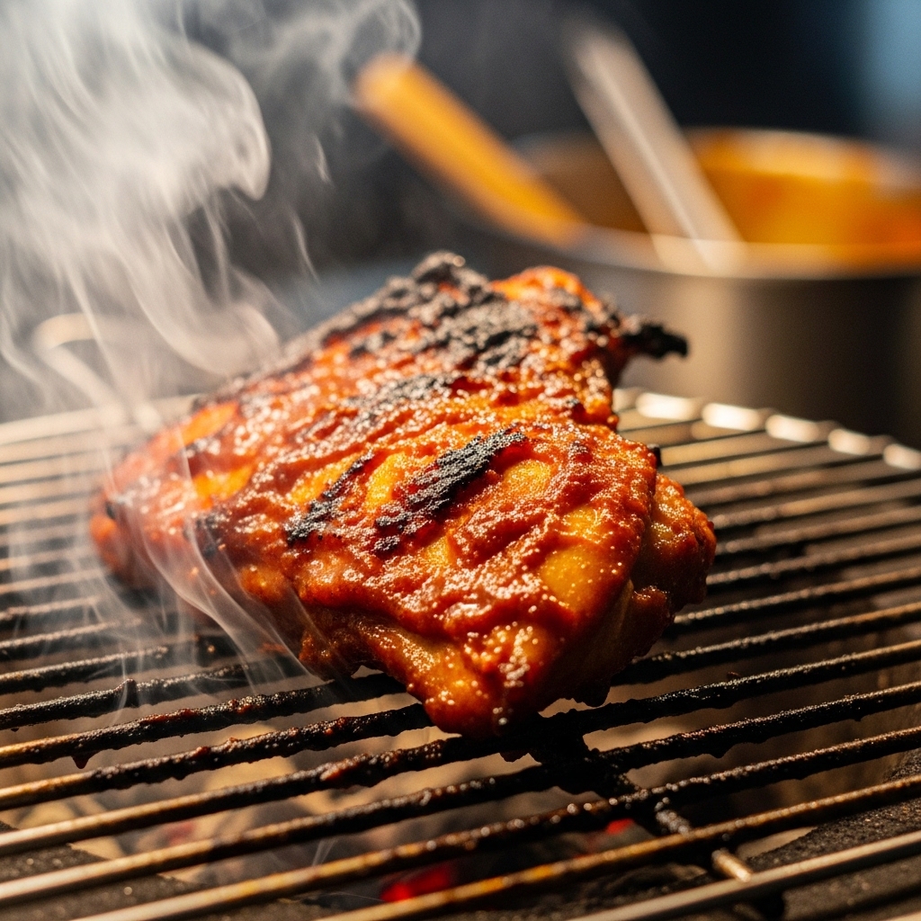 - Karamelisasi Panggangan Maksimal (Thick Glazing): Bumbu yang menempel kental dan padat pada daging segar akan langsung terkaramelisasi dengan cantik saat bersentuhan dengan bara api arang. Kulit ayam akan berlapis bumbu kemerahan yang glossy (mengkilap). Jika bumbu encer karena air es, bumbu hanya akan menetes jatuh ke arang, memicu kepulan asap hitam yang membuat ayam terasa pahit.