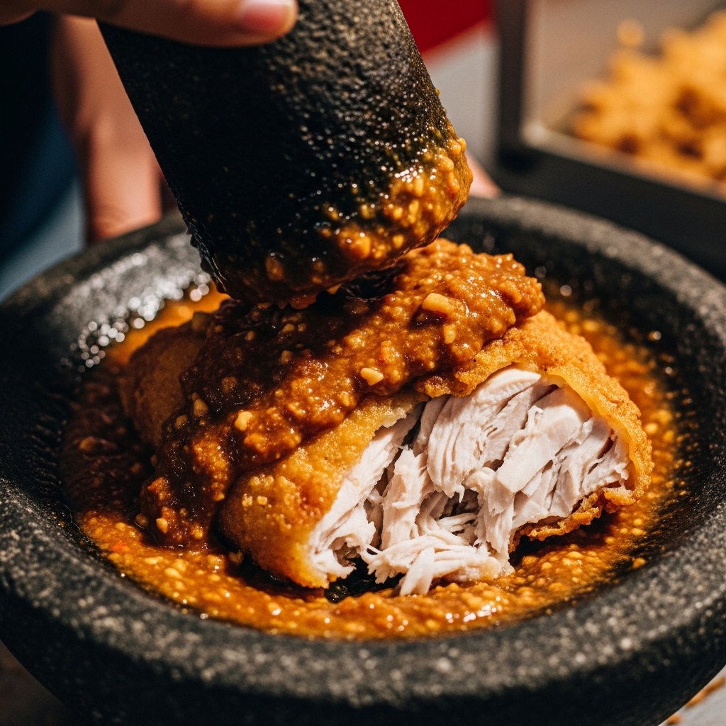 - Maksimalisasi Penyerapan Sambal (Flavor Absorption): Tujuan utama ayam digepuk adalah memecah struktur daging agar saus sambal bisa masuk. Serat ayam segar yang hancur terurai bertindak layaknya spons. Genangan minyak gurih, bawang putih mentah, dan ulekan kacang akan langsung terhisap ke dalam serat daging terdalam, memberikan ledakan rasa di setiap gigitan pelanggan.