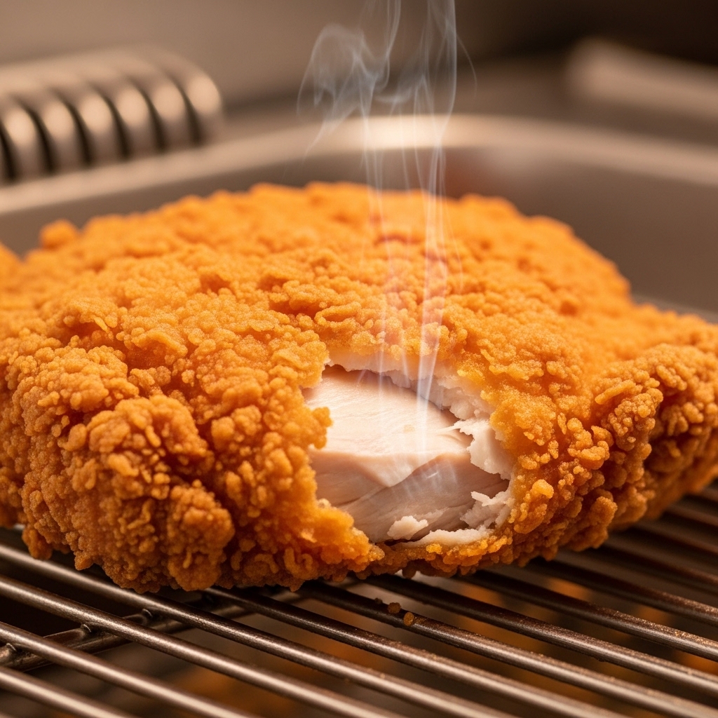 - Pembentukan Kerak Segel (Crust Sealing): Ketika ayam bersuhu ruang masuk ke minyak bersuhu 180°C+, lapisan tepung luar seketika mengalami dehidrasi kilat dan mengeras. Kerak pelindung ini mencegah minyak meresap masuk ke dalam daging (membuat ayam tidak berminyak/greasy) sekaligus memblokir uap air dari dalam daging agar tidak keluar, sehingga daging tetap juicy.