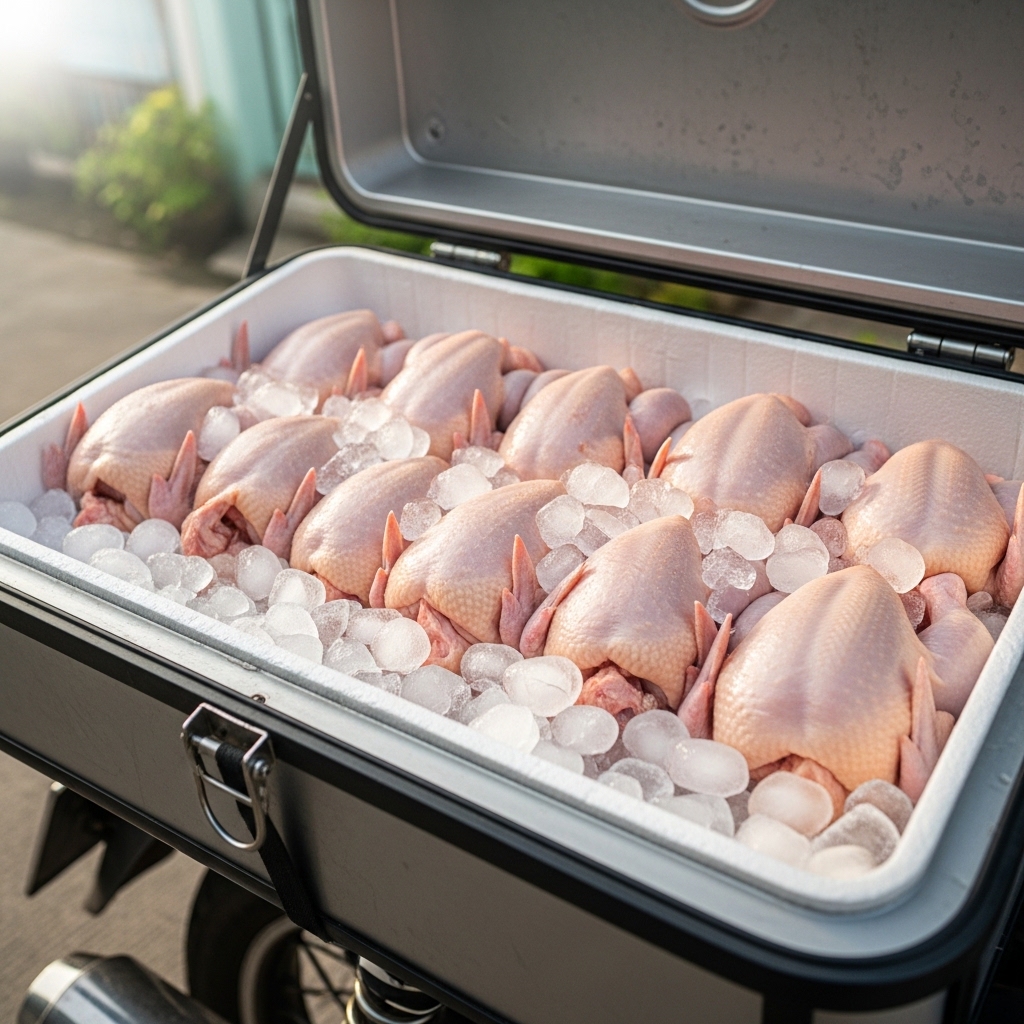 - Teknik Lapisan Es Dasar (Bottom Icing): Karena karkas fresh daily Tricik sudah dingin saat tiba di pagi hari, Anda tidak perlu membekukannya. Anda cukup meletakkan sedikit pecahan es batu atau ice gel di dasar boks motor keliling, lalu menata ayam di atasnya. Suhu sejuk dari bawah akan menjaga ruang boks tetap dingin seperti kulkas berjalan selama Anda berkeliling di pagi hingga siang hari.