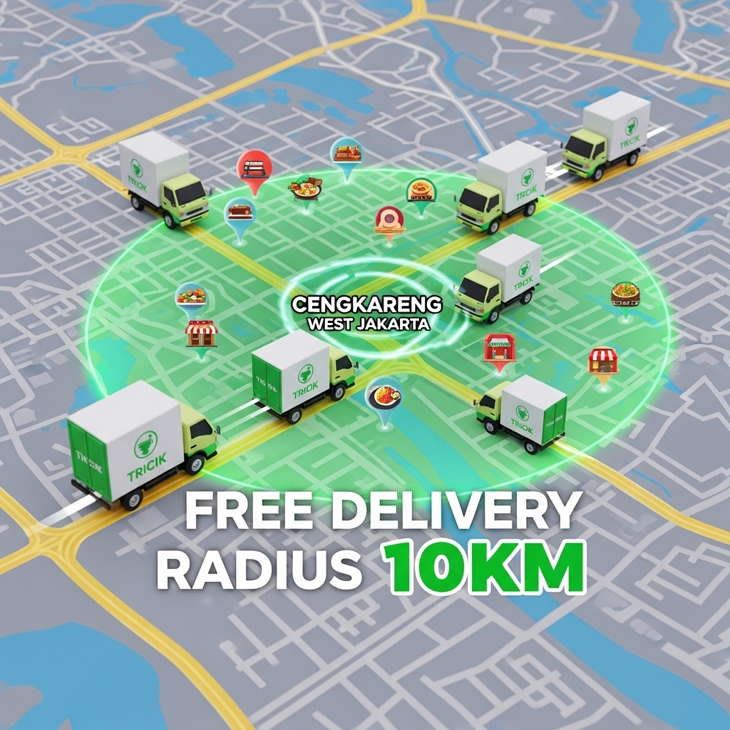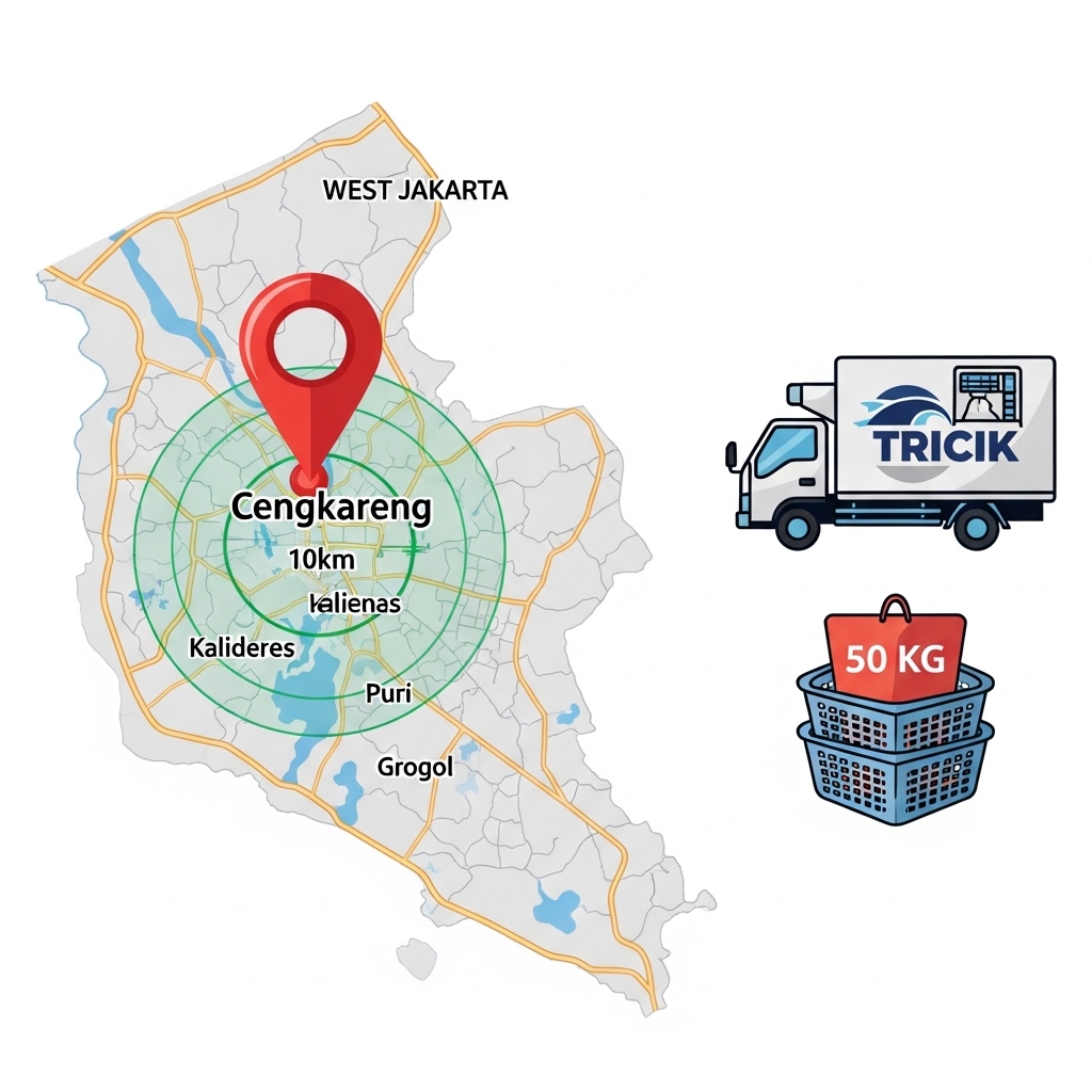 Tekan biaya operasional restoran Anda dengan layanan Gratis Ongkir Tricik di Cengkareng & sekitarnya. Simak syarat minimal order 50kg dan cakupan wilayahnya di sini.